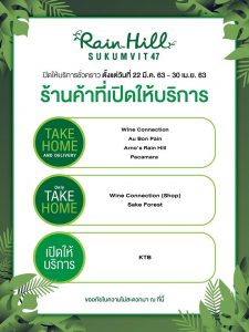 ศูนย์การค้า Rain Hill มีความจำเป็นที่ต้องปิดให้บริการชั่วคราวตั้งแต่วันที่ 22 มีนาคม 2020 – 30 เมษายน 2020 ยกเว้นบางร้านค้าที่ยังเปิดให้บริการสำหรับธุรกิจบางประเภท ดังต่อไปนี้